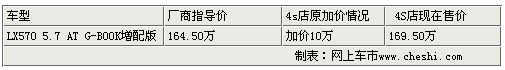 如果提到豪華SUV,大家一定首先想到寶馬X6、奔馳GL、保時(shí)捷卡宴以及路虎攬勝等豪華SUV中的“大佬”們,作為國際知名越野極強(qiáng)悍的汽車品牌,雷克薩斯的每一款車型都可謂經(jīng)典,而雷克薩斯LX570又重新詮釋了豪華SUV的新尺度,與上一代的LX470相比,你卻不得不承認(rèn)雷克薩斯的LX系列正在以跨越的方式完成自己的進(jìn)化。近日,近日根據(jù)網(wǎng)上車市價(jià)格檢測系統(tǒng)顯示,目前雷克薩斯豪華SUV-LX570加價(jià)較上段時(shí)間的10萬元較少了一半,僅加價(jià)5萬進(jìn)行銷售,而且有現(xiàn)車供應(yīng),具體情況請參照下表: