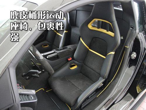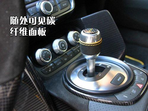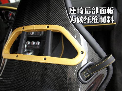 車廂內飾運用灰色和金色雙色搭配,桶形運動座椅為PPI特別定制,主要乘坐區域為麂皮打造。特別值得一提的是座椅后部支撐面板也是碳纖維材料制成,中控和方向盤等地隨處可見碳纖維裝飾面板。