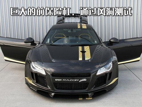 PPI打造的改裝版R8命名為RAZOR GTR-10,這個名字中的10意味只限量改裝10臺。RAZOR GTR-10是一款高性能全碳纖維輕量化超級跑車,前臉換裝了巨大的碳纖維運動前保險杠,完美的運用了空氣動力學并通過了風洞測試。前備箱蓋一側有兩條金色賽道紋貫穿車身前后。