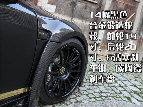RAZOR GTR-10裝配14幅黑色合金鍛造輪轂,采用前19寸后20寸的搭配比例,輪胎規格為前245/35 ZR19后325/25 ZR20。輪轂內清晰可見6活塞黑色剎車鉗,配合它的是碳陶瓷高性能剎車盤。