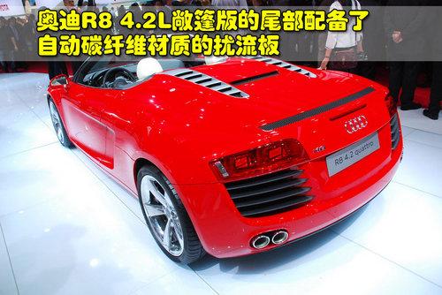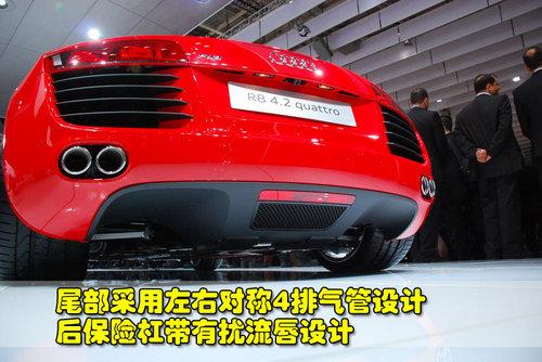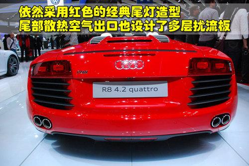 奧迪R8 4.2L敞篷版的尾部配備了自動升級的碳纖維材質擾流板,可以進一步減輕車身自重。這款新車的尾部依然采用紅色的經典尾燈造型,而且尾部的散熱空氣出口也設計了多層擾流板。奧迪R8 4.2L敞篷版尾部采用左右對稱的4排氣管設計,后保險杠也采用了擾流唇的設計。