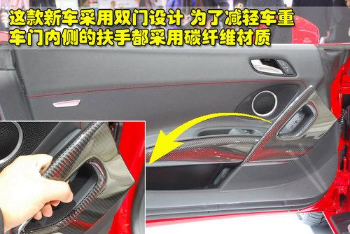 奧迪R8 4.2L敞篷版采用雙門開啟方式,為了減輕車重,車門內側的扶手都采用碳纖維材質打造。而且車門的內襯大部分都采用真皮材質包裹,質地非常柔軟。車門內側還設計了儲物空間,方便存放比較小的隨身物品。