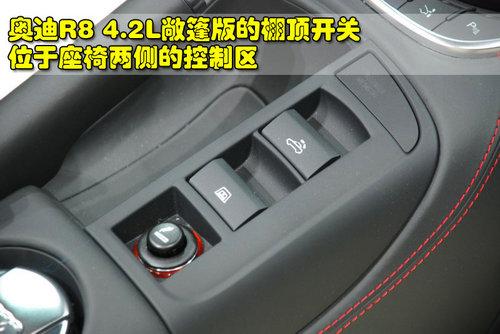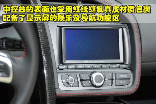 奧迪R8 4.2L敞篷版的中控臺周圍都采用真皮包裹,并且紅線縫制顯得運動感更強。中控臺兩側都采用了輕量化碳纖維裝飾板。中控臺頂部配備了大尺寸顯示屏,娛樂功能和導航功能都一應俱全。奧迪R8 4.2L敞篷版的頂棚開關位于中央扶手前的位置,獨立的設計方便方便駕駛員或操作。