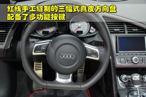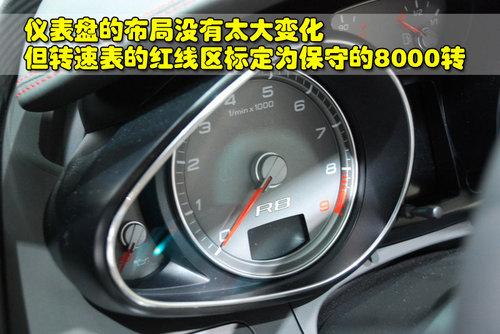 奧迪R8 4.2L敞篷版采用的是紅線手工縫制的三幅式真皮方向盤,并且配備了多功能按鍵。儀表盤的布局與5.2L車型并沒有太多變化,但由于引擎動力的減弱,轉速表的紅線區標定為相對比較保守的8000轉。
