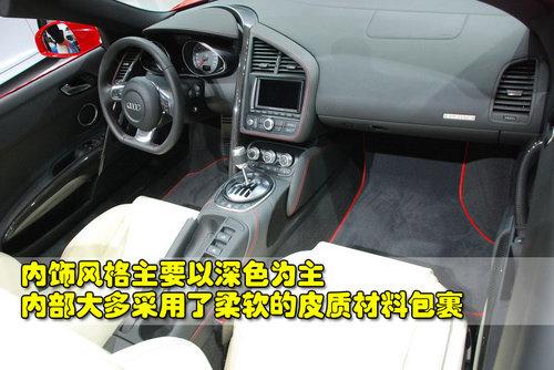 奧迪R8 4.2L敞篷版的內飾風格主要以深色調為主,可以很好的突出這款車的運動特征。中控臺以及中央扶手等部分大多采用了柔然的皮質材料包裹,不僅看上去顯得非常高檔,而且也保證了駕乘的舒適性。另外,這款車的內部也有很多細節是采用碳纖維材質。