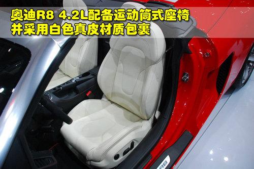 奧迪R8 4.2L敞篷版配備了運動型筒式座椅,并采用了白色真皮材質包裹,與內飾的整體色調相反,看上去個性鮮明。這款新車的座椅以及靠背兩側都比較突出,對身體的包裹性非常不錯,而且也采用了8向電動調節功能,方便駕駛員或乘員調整到最合適的坐姿。