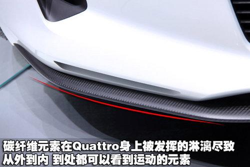 碳纖維元素在奧迪Quattro概念車身上隨處可見,車頭部位只是低調(diào)的在小包圍上用到了這一元素,等一會(huì)到車尾和內(nèi)部,大家就會(huì)認(rèn)可隨處可見這個(gè)詞,因?yàn)椋瑠W迪Quattro概念車身上真的配備了很多碳纖維面板。