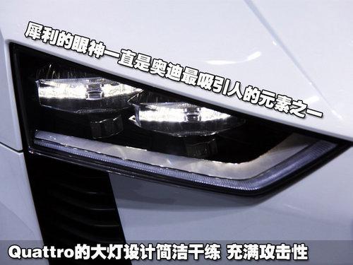 奧迪Quattro概念車的車燈看起來與家族其他車型有點(diǎn)相似,但仔細(xì)觀察也能看出不少不同。奧迪Quattro概念車的前燈并未采用多鍍鉻條式設(shè)計(jì),簡單的四邊形車燈搭配兩個(gè)角度略有不同的車燈,構(gòu)成了這一雙炯炯有神的眼睛,而且是一雙充滿攻擊性的眼睛。
