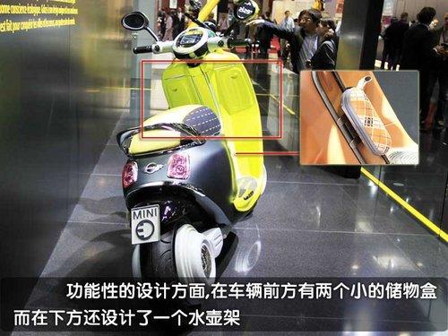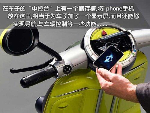 MINI Scooter E概念車將i phone手機(jī)與電動車融合,通過位于車輛頂端的專用接口。車主的i phone手機(jī)可以放置于其中,與車輛的音響和信息與了系統(tǒng)實(shí)現(xiàn)最大化的兼容。此外,還有一項(xiàng)有趣的功能,可以通過谷歌地圖來顯示其它騎車者的位置,甚至可以發(fā)出結(jié)伴而行的邀請。