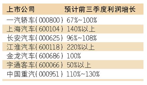 在車市產銷兩旺的背景下,汽車股前三季度業績狂飆。截至上周,大部分整車汽車股發布前三季度的業績預測,多數前三季度的凈利潤增長超過100%。良好的業績也刺激著汽車股股價不斷創出新高,由于業界猜測鼓勵汽車消費的政策可能在今年到期,因此到年底還將迎來一次銷售的大好形勢。