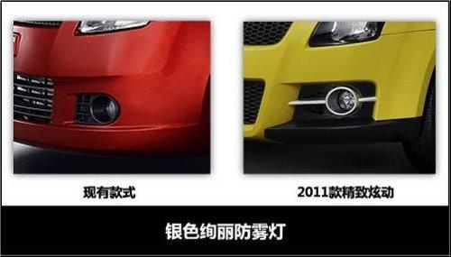 2011款雨燕在外型上與現款車型相比有了很大突破,甚至能夠稱之為運動款,運動元素遍布整個車身。前大燈、霧燈裝飾、前保險杠、進氣格柵均進行了重新設計。前臉上巨大的進氣口和黑底的前大燈顯得酷勁十足且更具侵略性;霧燈區域的變化也很搶眼,原本與條紋格柵相一致的黑色霧燈經過銀色裝飾后,視覺沖擊力更強。車身側面增加了空氣動力學側圍裙邊,動感魅力更加明顯。