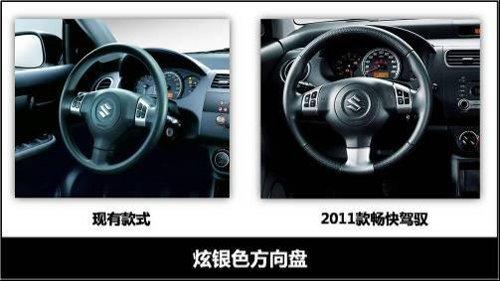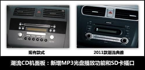 內飾方面,銀色成為雨燕2011款內飾的主色調。方向盤采用點狀皮紋,真皮觸感;經過重新設計的CD面板,按鍵布局更加合理,按鈕與銀色按鍵組合協調。CD還新增了MP3光盤播放功能和SD卡插口,可以播放多種格式音樂。