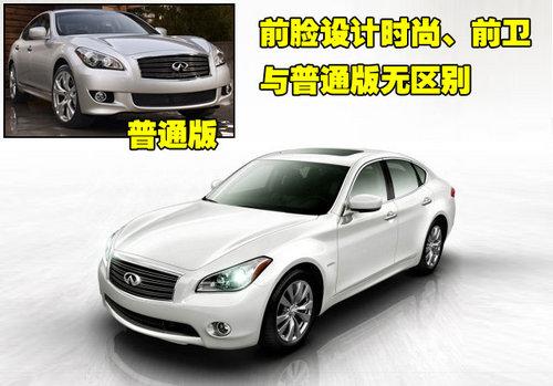 英菲尼迪M35的定位為豪華商務轎車,因此這款車型明顯比G系要穩重很多;旌蟿恿Π孳囆偷耐庥^設計與普通版M35沒有區別,前臉設計延續了英菲尼迪家族特征,大面積的鍍鉻進氣格柵再配合一體式氙氣大燈使這款車更加具有侵略性。