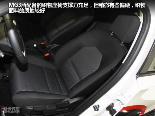 MG3配備的織物座椅與MG6裝備的織物座椅非常類似,支撐力充足,包裹感也比較到位,但座墊稍硬,會影響一些乘坐舒適感,還好織物座椅的面料質地不錯。這臺MG3展車配備了手動調節座椅,操作起來比較順手,人機工程學設計合理。