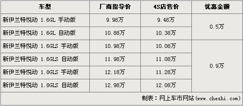 據北京現代經銷商處銷售人員介紹,新伊蘭特悅動全系車型最高優惠9000元。1.6L車型經5000元優惠后全系入門級的1.6L GL手動版的售價為9.48萬元,是全系的最低價格。銷售人員還介紹,1.6L車型現車充足,而1.8L車型店內現車有限顏色不全,欲購買無現車的1.8L車型消費者需交納3000元現金,等一周后可提車。