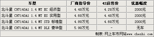 據(jù)昌河鈴木4S店銷售人員介紹,北斗星目前車型比較齊全,只有豪華型沒有現(xiàn)車銷售。其他三款車型都可以優(yōu)惠2000元。另外,北斗星AMT版本將會在近期到店,目前還沒有這款車的售價(jià)及具體到店日期,所以還不能接受預(yù)訂。