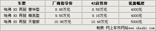 據(jù)長(zhǎng)城汽車4S店銷售人員介紹,長(zhǎng)城哈弗H3的現(xiàn)車都比較齊全,并且出現(xiàn)了較多的優(yōu)惠幅度。其中豪華型和精英型能夠優(yōu)惠4000元,而天窗版則優(yōu)惠5000元。另外銷售人員表示,長(zhǎng)城哈弗H3的廠商指導(dǎo)價(jià)只是白色普通漆車型,金屬漆其他顏色車型需要加價(jià)2000元。