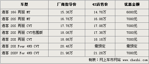 逍客是在國內上市的第一款真正意義上的跨界車,它同時也是日產歐洲設計中心成立之后開發的第一款新車,既擁有SUV的時尚外觀和越野性,又有轎車的舒適性和省油優勢。根據網上車市價格監測系統顯示,目前逍客全系最高優惠7000元,具體車型以及價格如下: