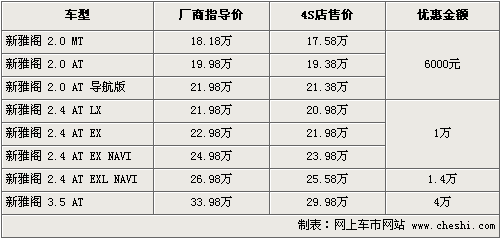廣州本田新雅閣是中級車市場最暢銷的車型之一,也是廣州本田的旗艦車型。目前新雅閣在原來優(yōu)惠基礎(chǔ)上,車價(jià)有一定幅度的變化,其中最高優(yōu)惠幅度達(dá)到了4萬元,具體車型以及價(jià)格如下列表: