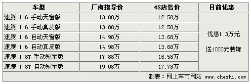 據(jù)4S店銷售人員介紹:目前速騰全系優(yōu)惠1.3萬元,較之前優(yōu)惠幅度有所增加,如在店內(nèi)做一條龍服務(wù)還可獲贈價(jià)值1000元的裝飾,裝飾主要包括腳墊、座套等。由于2.0升車型停產(chǎn),所以目前只有1.6升和1.8TSI車型。1.6升車型更注重經(jīng)濟(jì)型,而1.8TSI更加注重動力表現(xiàn)。
