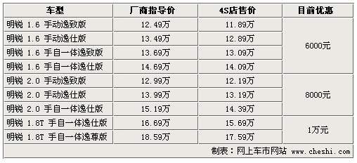 據(jù)4S店銷售人員介紹:目前明銳全系最高優(yōu)惠1萬元。1.6升車型優(yōu)惠6000元,2.0升車型優(yōu)惠8000元,1.8TSI的兩款車型優(yōu)惠1萬元。雖然優(yōu)惠幅度較之前有所增加,但目前依然沒有現(xiàn)車,訂車最短需等一個半月,最長需等3個月。不過,某些店內(nèi)有很少量現(xiàn)車,但優(yōu)惠幅度較小,所以建議不著急用車的朋友預(yù)定車輛可獲得更高的優(yōu)惠。