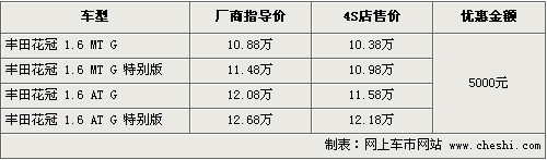 國產花冠已經是其第九代產品,尤其值得稱道的是其VVT-i發動機,這是豐田國產車型中首款采用此發動機的車型。國產后這款車的表現依然如日中天,成為一汽豐田的看家產品。根據網上車市價格監測系統顯示,目前花冠全系車型出現了5000元的優惠幅度,具體車型以及優惠如下: