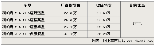 據雪佛蘭4S店銷售人員介紹:目前2.4升排量車型現車較為充足,顏色較齊全,白色、銀色現車很多,但無紅色車型,如預定需要等待1-2周時間。3.2車型依舊無現車,訂車需等一個月時間。科帕奇全系目前可優惠1萬元現金,不送任何裝飾。