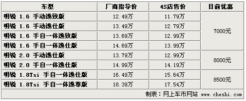 據(jù)4S店銷售人員介紹:目前明銳全系最高優(yōu)惠8500元。1.6升車型優(yōu)惠已達(dá)7000元,較之前優(yōu)惠幅度增加了1000元。2.0升車型優(yōu)惠仍為8000元,1.8TSI的兩款車型優(yōu)惠8500元,較之前有所縮水。雖然1.6升車型優(yōu)惠幅度較之前有所增加,但目前全系依然沒有現(xiàn)車,訂車最短需等一個半月,最長需等3個月。不過,某些店內(nèi)有很少量現(xiàn)車,是訂車客戶已退車輛。但優(yōu)惠幅度較小,所以建議不著急用車的朋友預(yù)定車輛可獲得以上優(yōu)惠。如在店內(nèi)做裝飾還可打8折,雖然折后裝飾價格仍有些偏高,但產(chǎn)品質(zhì)量可以保證。