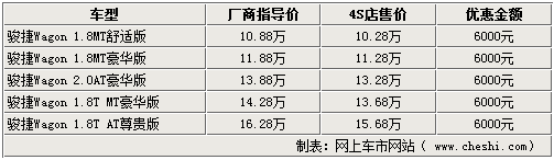 據銷售人員介紹,雖然兩款增壓版駿捷Wagon車型調價,但各店內銷售的駿捷WAGON車型仍可給出1.1萬元的現金優惠,店內在售的主要為1.8L的手動版車型,而2.0L以及1.8T的車型較少,如需購買仍需提前預訂,訂金為5000元,一個月左右的時間即可提車。