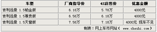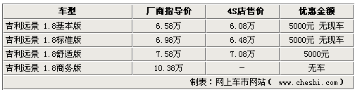 作為一款上市時間較長的車型,吉利遠景系列近期也開始加大優惠幅度促銷。網上車市網站近日由經銷商處了解到,現在購買遠景車型,將享受到最高5000元的現金優惠,不過各家4S店內的車型并不齊全,部分車型仍處于無車的狀態。具體詳情如下: