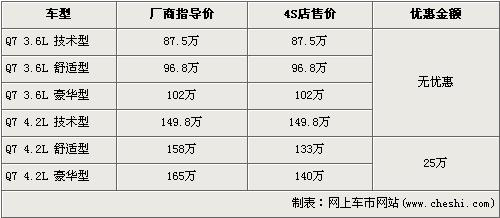 Q7是奧迪打造的第一款“高性能SUV”,同時(shí)也是奧迪引進(jìn)中國(guó)的第一款頂級(jí)SUV車(chē)型。Q7憑借杰出的運(yùn)動(dòng)性、高超的操控性及沖擊性極強(qiáng)的外形在上市時(shí)就獲得了人們的關(guān)注。隨著在上海車(chē)展亮相的改款新Q7即將上市,在售的老款Q7已經(jīng)停產(chǎn)。近日根據(jù)網(wǎng)上車(chē)市價(jià)格檢測(cè)系統(tǒng)顯示:在售的奧迪Q7出現(xiàn)了最高為25萬(wàn)元的優(yōu)惠,具體詳情請(qǐng)看下表: