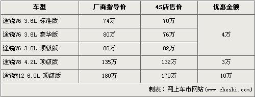 途銳是大眾首款引進(jìn)我國的SUV車型,在3.6L及4.2L率先上市后,大眾為了滿足消費(fèi)者的更大胃口,緊接著又推出了搭載12缸發(fā)動(dòng)機(jī)的6.0L車型。隨著大排量消費(fèi)稅的頒布,給9月份后入關(guān)的大排量車型帶來了一次不小的沖擊,令大排量汽車價(jià)格都上調(diào)了不少,大眾途銳6.0L頂級(jí)版也從原來158萬元的價(jià)格上調(diào)至了180元。近日據(jù)網(wǎng)上車市價(jià)格系統(tǒng)監(jiān)測顯示,大眾途銳全系的最高優(yōu)惠達(dá)到了10萬元,具體詳情請看下表: