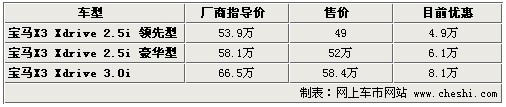 繼X5成功的引進我國后,寶馬又將其X系列旗下的緊湊型SUV寶馬X3帶到了中國。目前國內在售的X3 2.5Si與X3 3.0si是在X3基礎上衍生而成的運動版車型,將寶馬特有的靈敏性與運動型多用途車的廣泛實用性完美結合。近日據網上車市價格數據監測顯示,寶馬X3全系最高有近8.1萬元的現金優惠,具體詳情請看下表: