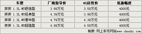 作為國內微型轎車中的經典車型,長安奔奔從上市至今都有著不錯的銷量表現,而且長安奔奔也在每年針對產品進行更新換代,以適應市場所需。網上車市網站由經銷商處了解到了,剛剛進入9月份,長安奔奔系列車型的優惠幅度有所變動,全系僅優惠4000元。詳情如下: