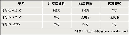 據北京悍馬經銷店銷售人員介紹,目前市場上在售的悍馬分為H2 6.2L和H3 3.7L以及H3 5.3L ALPHA 三款車型。近期購買悍馬H2 6.2L車型的消費者可以得到7萬元的優惠,經優惠后售價降到了138萬元。H3 3.7L店內沒有現車,所以沒有任何優惠。H3 ALPHA經1萬元優惠后,售價從85萬元下降到了84萬元。