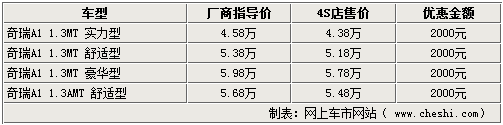 09款奇瑞A1系列在老款車型的基礎上增加了實力型和AMT兩種新車型,同時舒適型和豪華型官方降價4000元,售價已進入五萬元以內。網上車市網站近日了解到,各家4S店內的新車價格有所變化,全系車型均可小幅優惠2000元。詳情如下: