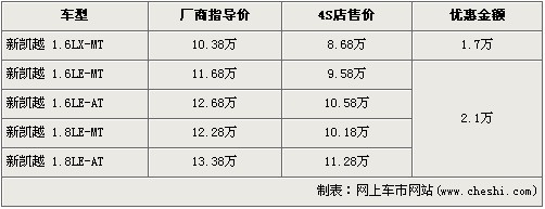 據(jù)4S店銷售人員介紹,新凱越分為1.6L與1.8L兩種排量車型,目前新凱越除了入門級的1.6LX-MT版優(yōu)惠1.7萬外,其他車型均優(yōu)惠2.1萬元。經(jīng)優(yōu)惠后,全系的最低價格降到了8.68萬元。銷售人員還介紹,新凱越店內現(xiàn)車比較充足,消費者挑選的空間較大。