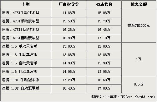 自來勢洶洶的速騰1.4TSI車型于上個月上市以后,一汽大眾旗下主打緊湊車市場的速騰車系隊伍再次得到了擴大,同時也得同級競爭車型帶來了強烈的競爭。近日據(jù)網(wǎng)上車市價格系統(tǒng)檢測顯示,少量速騰1.4TSI現(xiàn)車已經(jīng)進駐一汽大眾4S店,并且全系有最高1萬元的優(yōu)惠,具體車型價格詳情請看下表: