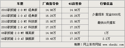 據(jù)東風(fēng)雪鐵龍銷(xiāo)售人員介紹,2010款凱旋目前沒(méi)有任何優(yōu)惠,車(chē)型顏色也不太齊全,預(yù)訂訂金為5000元,最快20天可提車(chē)。另外08款凱旋還有少量現(xiàn)車(chē)低價(jià)甩貨,最高優(yōu)惠幅度為2.2萬(wàn)元左右,顏色以黑色、銀色為主。北京地區(qū)各4S店由于訂單不同,各店銷(xiāo)售的現(xiàn)車(chē)顏色有所不同。