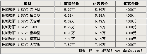 本次長城炫麗首先由廠家開始優惠,全系車型中1.3L兩款車型官降4000元,其他車型均降3000元。而經銷商處則可在廠家官降的基礎上再給出千元的優惠。
