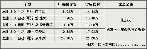 據北京現代北京地區4S店銷售人員介紹,途勝車型優惠現金2萬元或贈送購置稅及全年保險,兩 項優惠只能選擇其一。目前店內現車供應主要為銀色、黑色為主,四驅部分車型需要預訂,訂金5千元,一周左右時間可以提車。如消費者有意購買,到店詳談會有 更優惠的價格。北京地區各4S店由于訂單不同,各店銷售的現車顏色有所不同。