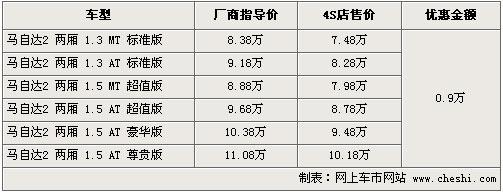 馬自達(dá)2系列是日系A(chǔ)0級(jí)車中的一款優(yōu)秀小生,結(jié)合了良好的安全性、舒適性及燃油經(jīng)濟(jì)性表現(xiàn),非常適宜首次購(gòu)車的用戶。目前馬自達(dá)2兩廂最高可以優(yōu)惠現(xiàn)金0.9萬(wàn),具體行情參考如下: