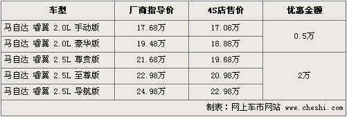 睿翼是一汽馬自達旗下的主力車型,憑借著運動性的流線型外觀和精準的操控性贏得了消費者的青睞。隨著2.0排量車型在10月22日正式上市銷售,目前一汽馬自達睿翼已推出五款車型分別覆蓋了2.0和2.5排量。據網上車市價格監測系統顯示:目前這款車的最高優惠持續在現金2萬元。具體車型行情如下: