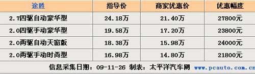 日前,編輯走訪北京現代二級經銷商時了解到,目前購買途勝全系車型可享受最高2.78萬元現金優惠,其中2.0兩驅手動時尚型最終售價僅為14.8萬元,優惠后的性價比還是很不錯的,店內現車情況較充足,具體詳情見下表: