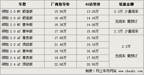 據北京現代4S店銷售人員介紹,相比前段時間的優惠幅度,目前領翔全系優惠幅度有所加大,最高可優惠2.3萬元,入門級車型僅售13.28萬元。現車方面供貨比較緊張,只有2.0手動舒適版和自動豪華版有現車,僅有黑色,顏色不全。如果預訂的話交5000元訂金,半個月左右可提現車。