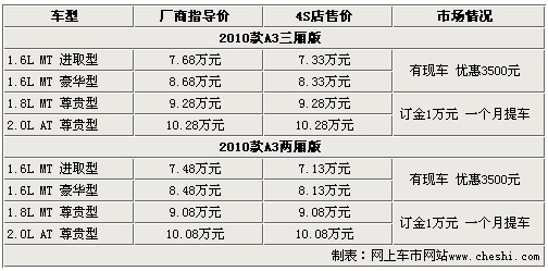 奇瑞A3是奇瑞汽車所生產的一款成功轉型的產品,自上市以來激起了廣大消費者對自主品牌追捧的新浪潮。奇瑞A3外觀時尚、運動,迎合時代潮流,超高的性價比造就了奇瑞A3的銷量直線上升。2010款奇瑞A3的表現也不遜色于老款產品,增加了更多時尚元素和實用配置。網上車市走訪了北京地區奇瑞4S店,得到了2010款奇瑞A3最新的市場消息,具體信息請參考下表: