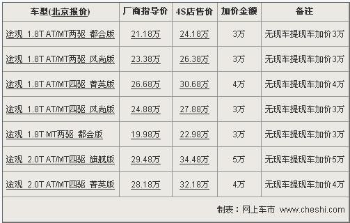 記者從上海大眾4S店獲悉,由于受到上海大眾產(chǎn)能影響及龐大的訂單影響,途觀目前購(gòu)車無(wú)法給出一個(gè)明確提車時(shí)間,并且在沒(méi)有現(xiàn)車的情況下,還需加價(jià)3-5萬(wàn)元不等。途觀按照配置不同加價(jià)有所不同,都會(huì)版及風(fēng)尚版購(gòu)車需加價(jià)3萬(wàn)元,菁英版購(gòu)車需加價(jià)4萬(wàn)元,而售價(jià)最高的旗艦版車型需加價(jià)5萬(wàn)元。但消費(fèi)者可以不必?fù)?dān)心,如果交付定金后,等待時(shí)間較長(zhǎng),4S店可將定金完全退回。