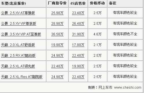 中級豪華車的標桿-------新天籟全系采用了CVT無級變速箱,連續的動力輸出雖然少了駕駛激情,但順暢的動力輸出帶來了平順的駕乘感受,日產系列發動機不錯的抑噪能力也是很有群眾口碑的,配合新天籟寬大舒適的座椅,無論是駕駛還是乘坐,都是一種愜意的享受,商用和家用兩者皆可。近日根據網上車市價格監測系統顯示,目前購買天籟最高可以享受到4.7萬元的價格優惠,最低售價僅為17.88萬,具體車型售價見下表: