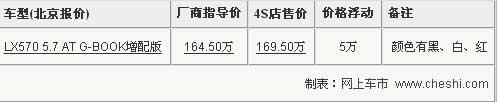 編輯從北京地區雷克薩斯4S店了解到,目前北京地區緩解了供應緊張的局面,所以購買雷克薩斯LX系車型出現了較上段時間加價十萬相對優惠的僅加價5萬的現車銷售,顏色有黑、白、紅少量可供選擇。如果選擇其他顏色,交車款的30%的定金,最多等待2個月消費者便可提車。如消費者有興趣的話,可以致電經銷商處詳詢。由于北京汽車市場變化較快,各店所銷售車輛顏色可能會有所差異。