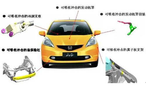 當行人與車輛發生交通事故時,最主要的死亡原因是來自于行人頭部的傷害,而最主要的重傷部位是腿部。如下圖所示,為了保護行人頭部,飛度的發動機罩、翼子板支架等部位采用了碰撞吸能結構;為了保護腿部,保險杠的前部也采用了碰撞吸能材料。